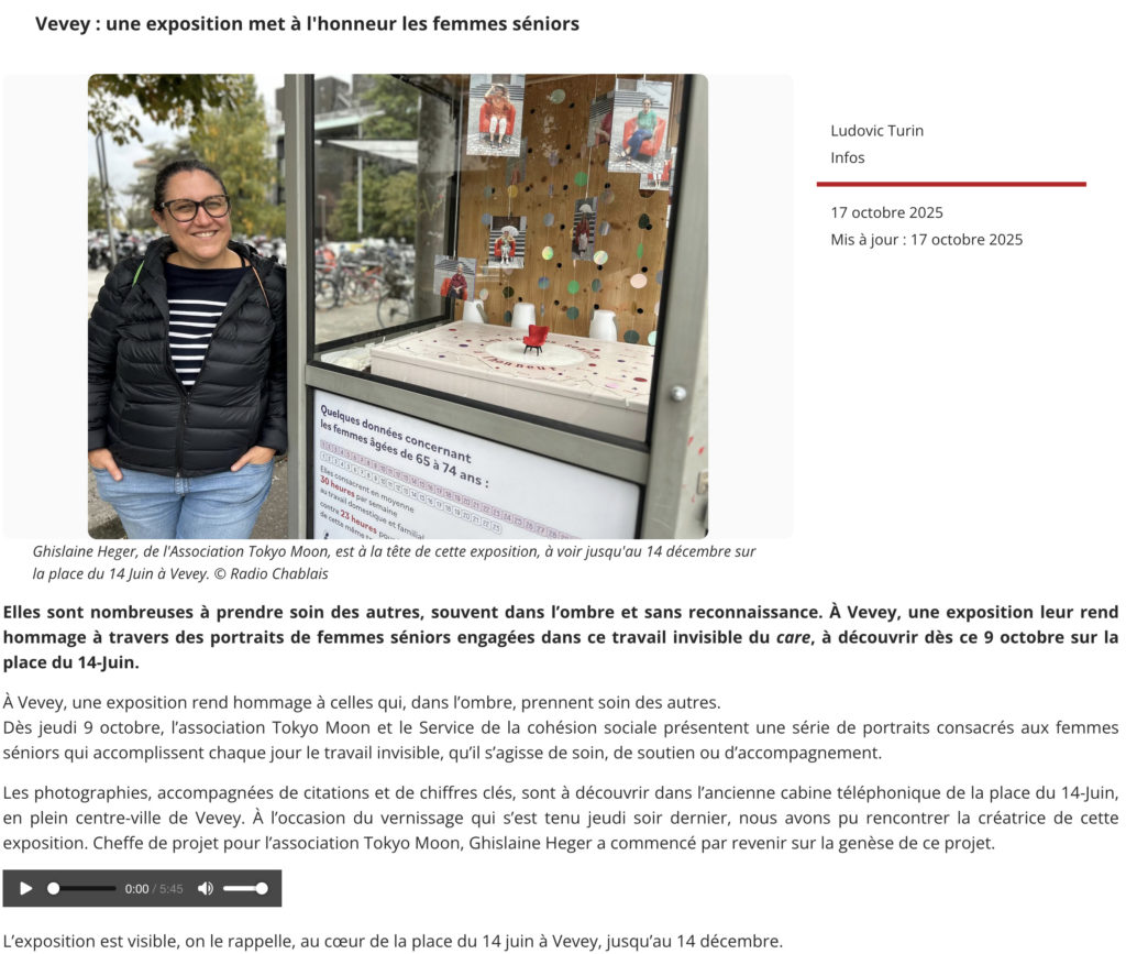 Pour rendre hommage à l’engagement social et au travail invisible effectué par les femmes seniors, notamment dans les sphères domestique et familiale, une séance photo a été organisée le 14 juin dernier devant l’Hôtel de Ville, à Vevey. Cette action s’inscrit dans les revendications de la Journée du 14 juin, qui milite pour l’égalité entre hommes et femmes, alors que celles-ci continuent d’accomplir l’essentiel du travail non rémunéré.